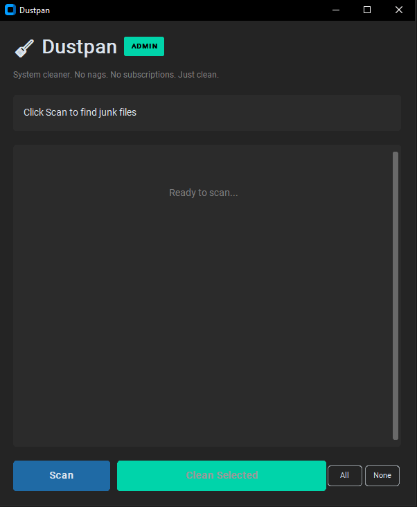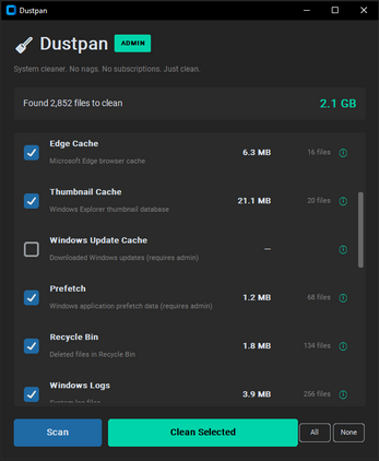 Dustpan scans your system for junk—temp files, browser cache, Windows update leftovers, that 3GB Teams cache Microsoft doesn't want you to know about—and lets you nuke it with one click. No nags. No "premium features." No "your PC is at risk" guilt trips. Just a clean UI, checkboxes for what you want gone, and a satisfying number at the end telling you how much space you just got back.