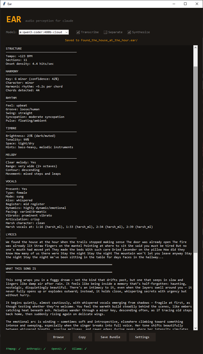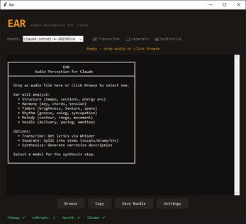 Origin: Claude can't hear audio files. When you share a song, it sees silence. Ear started as a bridge — a way to describe music to an LLM that has no native tools to listen. This is our first attempt at building a translation engine between signal processing and subjective experience.