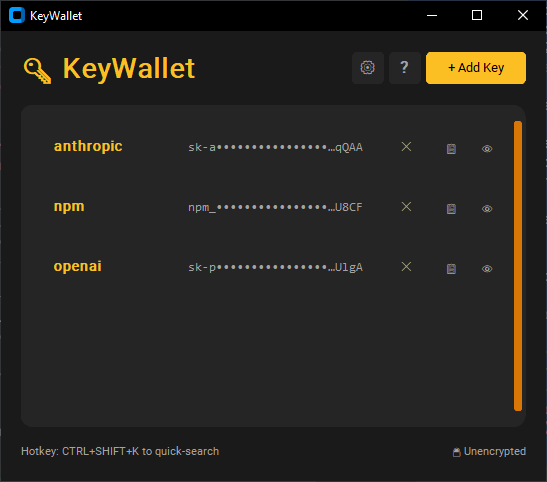 - Simple storage — Keys saved to ~/.keywallet.json for easy access in scripts