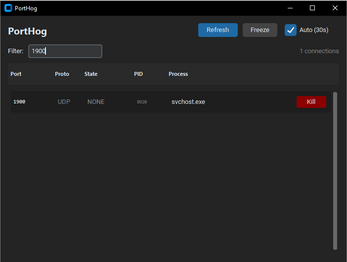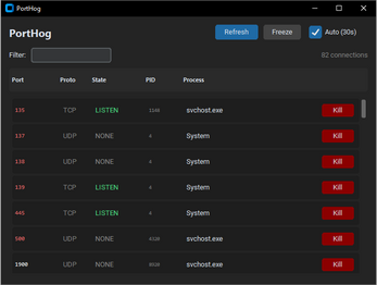 PortHog shows you every open port on your machine — what process is using it, what state it's in, and gives you a big red button to kill it.